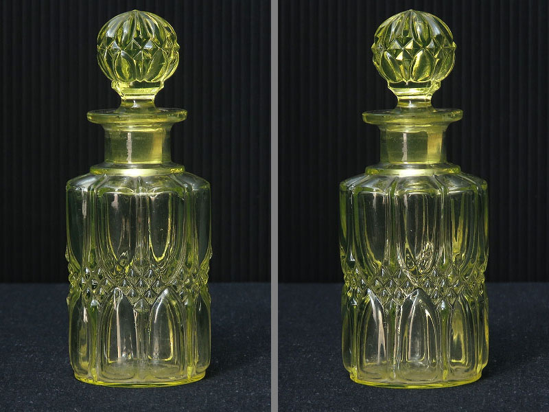《アウトレット》美しいカットが施されたウランガラスの小さなパフュームボトル(ヴァセリンガラス)