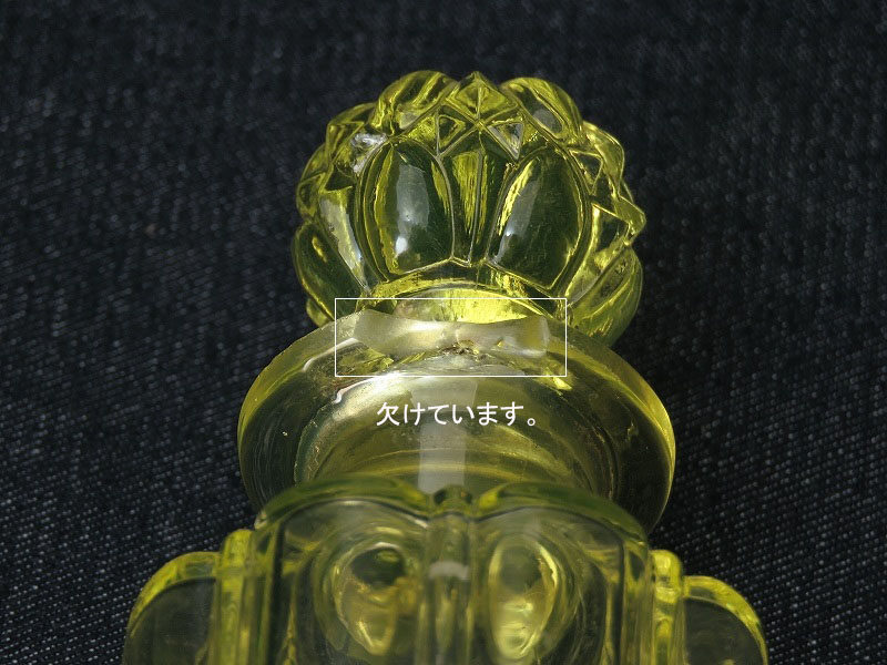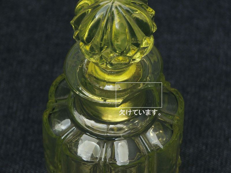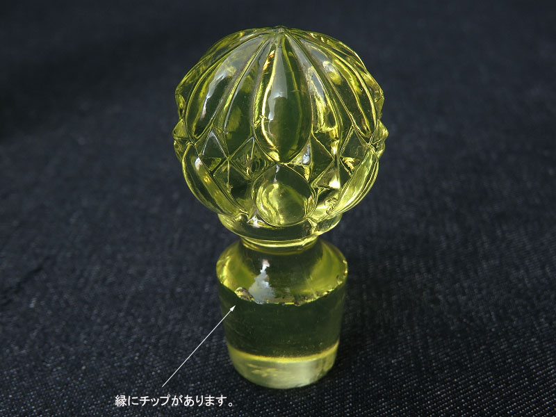 イギリスで買い付けた ウランガラス (ヴァセリンガラス) の香水瓶(パフュームボトル)です。蓋やボトルに施された美しいカットが魅力的な香水瓶です。瓶の口の部分に欠けがありますので《 アウトレット品 》として販売させていただきます。