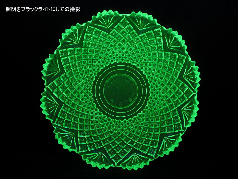 ・ウランガラス (ヴァセリンガラス) とは、ブラックライト (紫外線のライト) を当てると美しい蛍光色になるガラスで、ごく微量のウラン鉱石が原料に含まれています。製造され始めたのは1830年代で、それより1940年代までの間にグラスや花瓶などの各種ガラス器が数多く製造されていました。現在では民間でウランを扱うことが難しい為、稀少なガラス製品となっています。