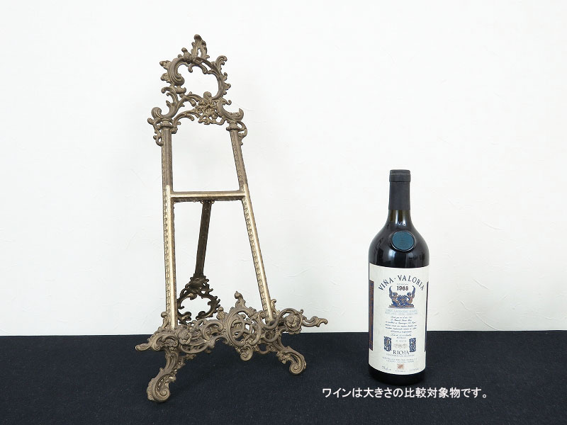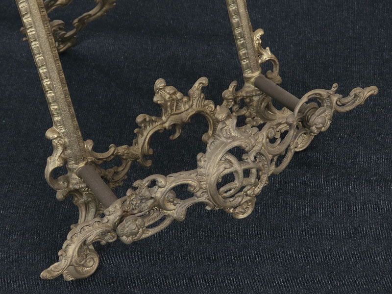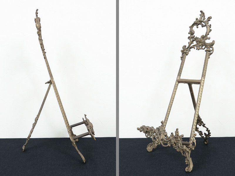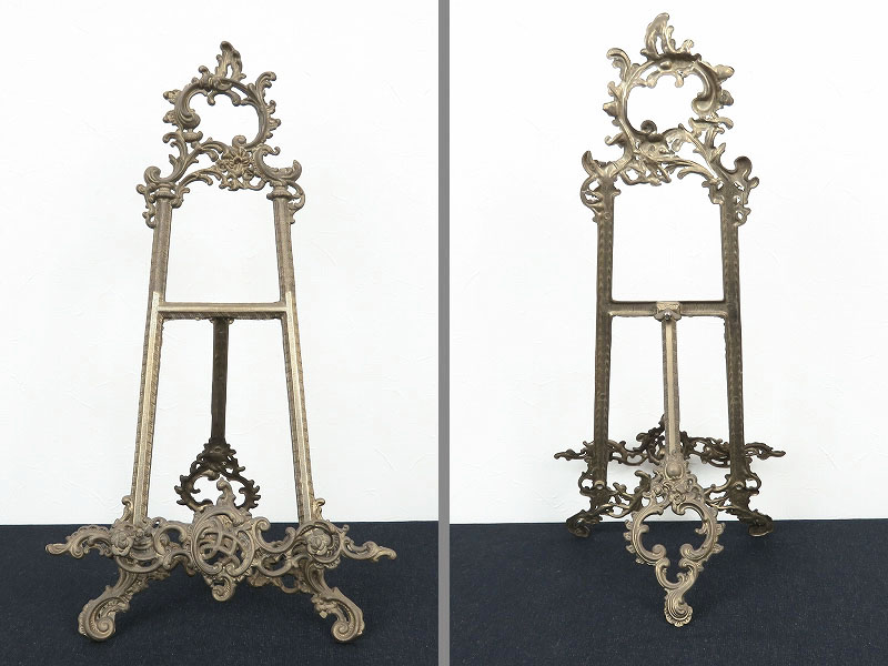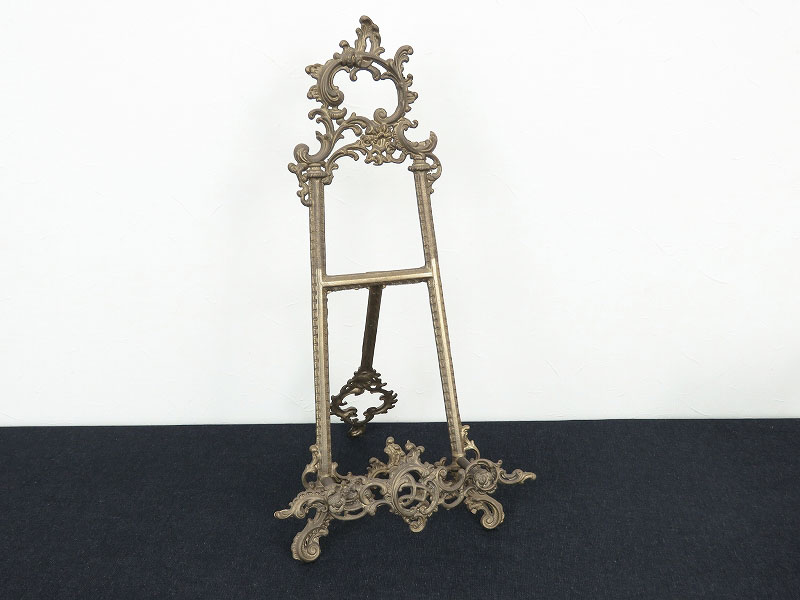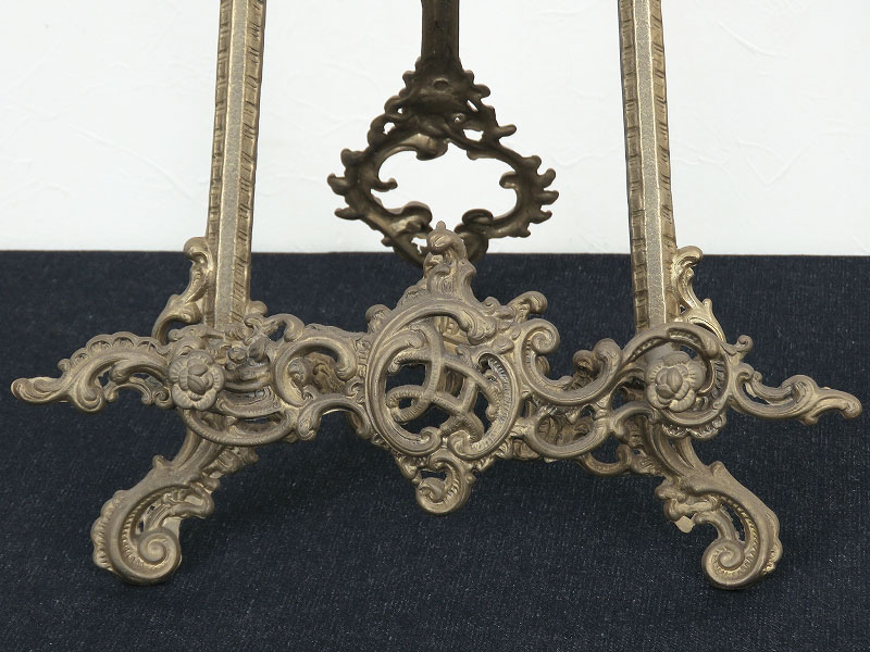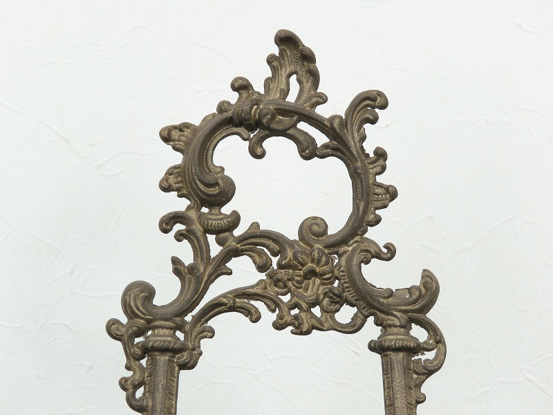 ベルギーの雑貨店で見つけたロココ調の真鍮製イーゼルです。アンティークではありませんが、デザインが良かったので店舗のディスプレイ用として購入しました。店頭でディスプレイしておりましたので、経年による変色がありよい風合いになっています。