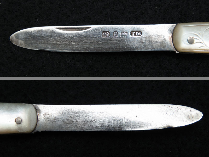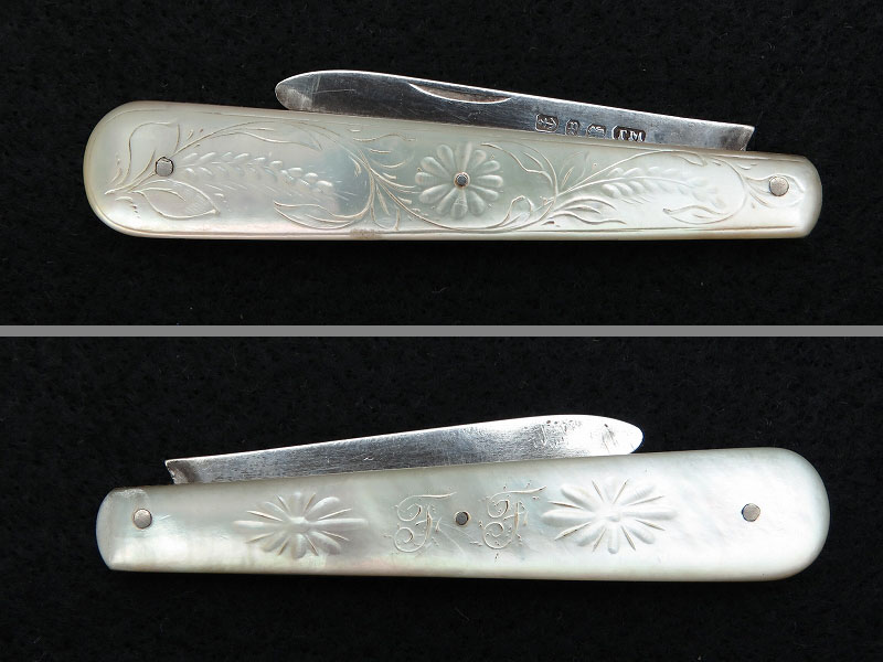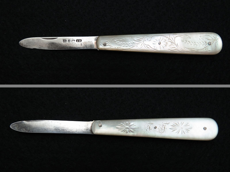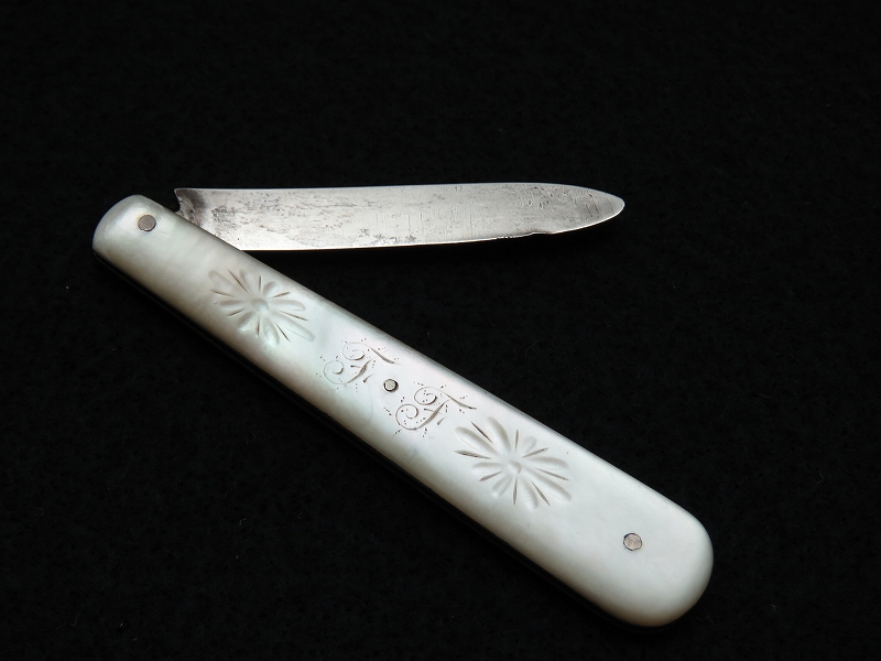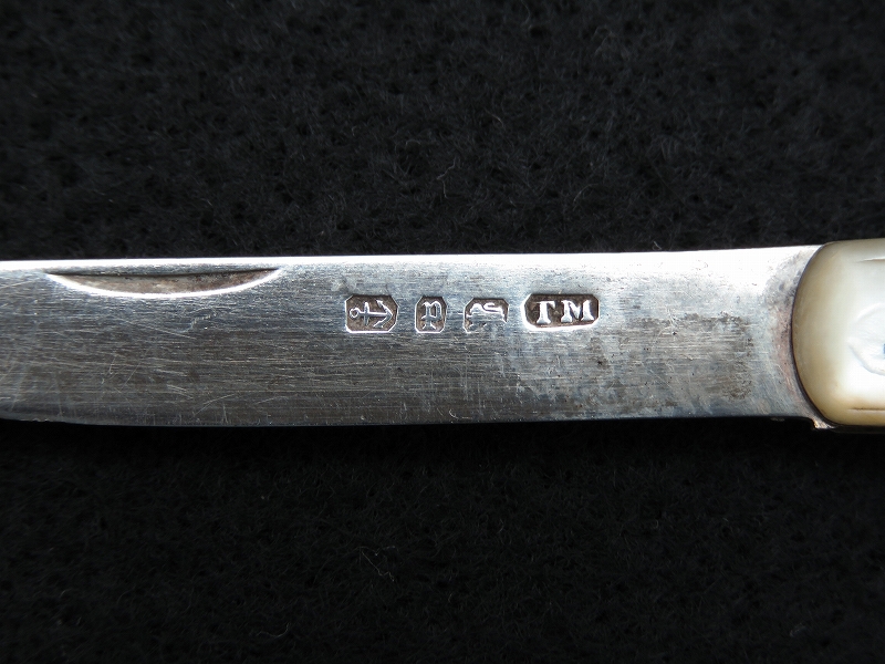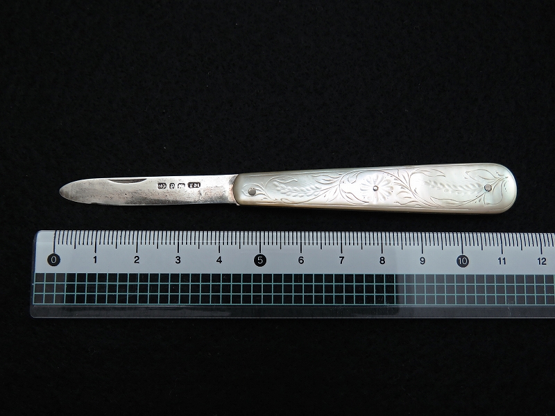 イギリスで買い付けたスターリングシルバーの折りたたみフルーツナイフ(フォールディングナイフ)です。白蝶貝(マザーオブパール)のハンドルに純銀のブレード(刃)がついた折りたたみ式となっています。 白蝶貝の輝きが美しいナイフです。ホールマーク(品質保証刻印)には「1914年 英国バーミンガム」を示す刻印があると現地ディーラーから説明を受けました。