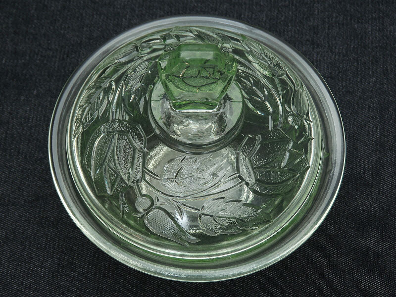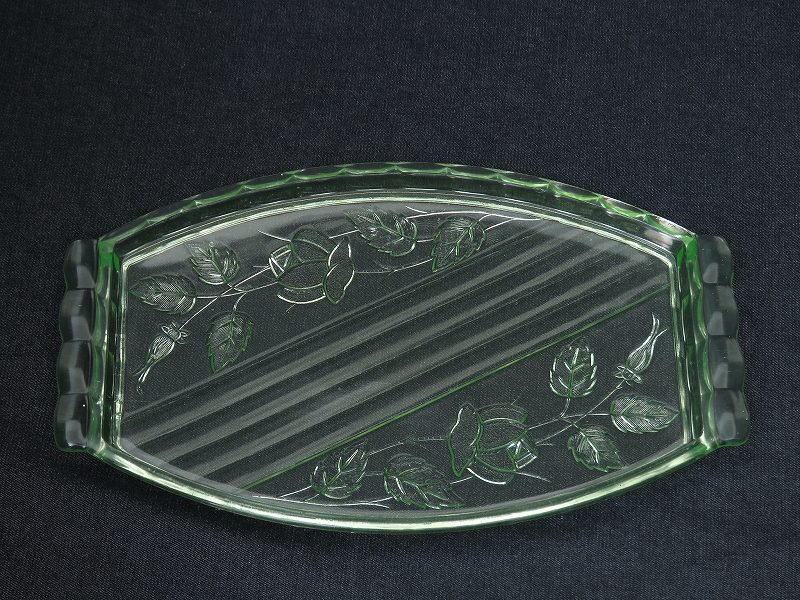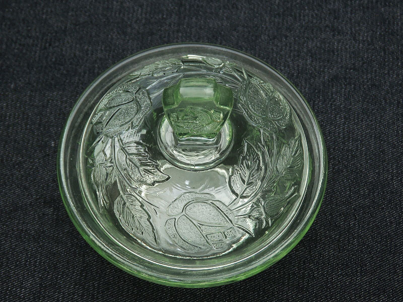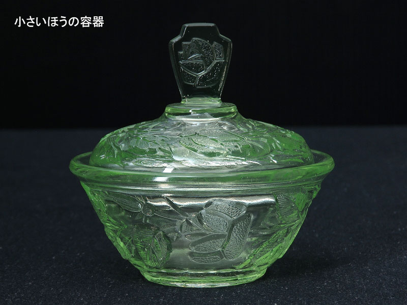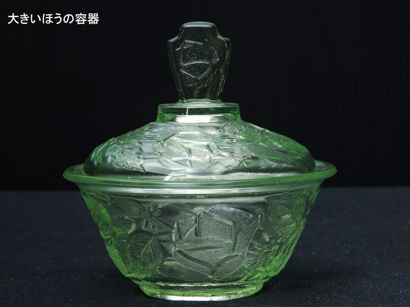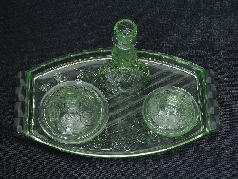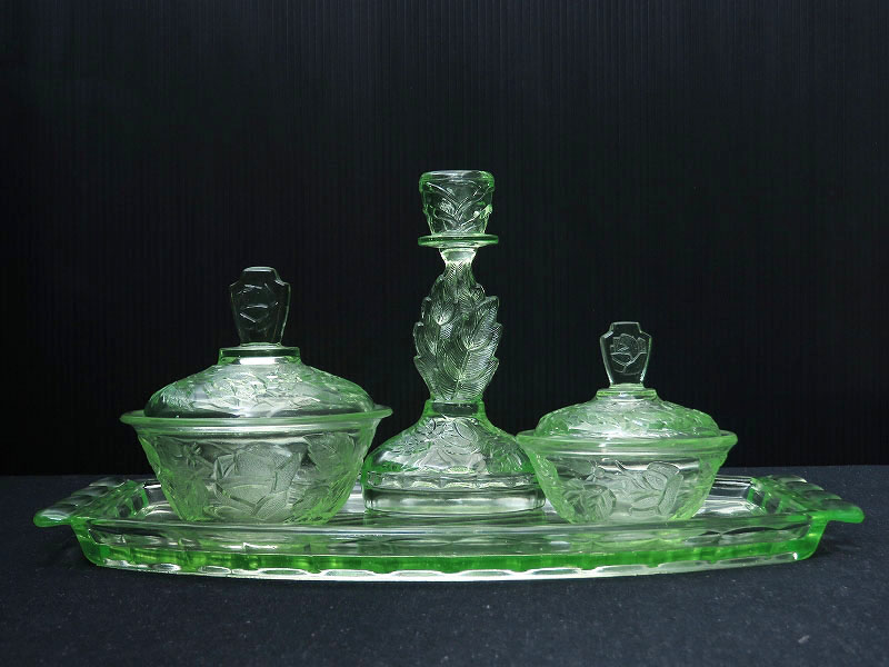 バラの花がデザインされたウランガラス製のドレッシングテーブルセット(ヴァセリンガラス)