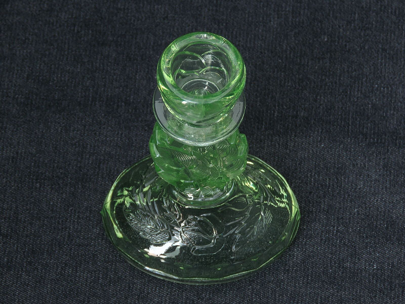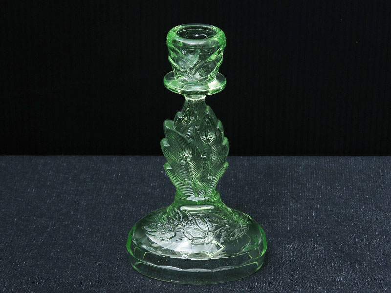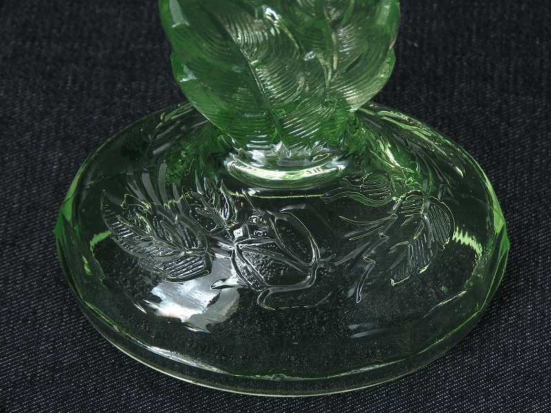 ・ウランガラス (ヴァセリンガラス) とは、ブラックライト (紫外線のライト) を当てると美しい蛍光色になるガラスで、ごく微量のウラン鉱石が原料に含まれています。製造され始めたのは1830年代で、それより1940年代までの間にグラスや花瓶などの各種ガラス器が数多く製造されていました。現在では民間でウランを扱うことが難しい為、稀少なガラス製品となっています。