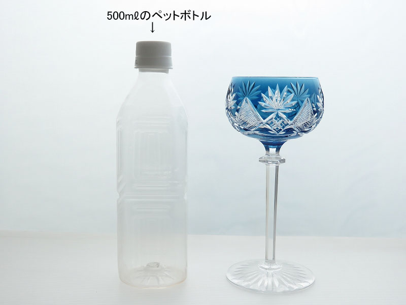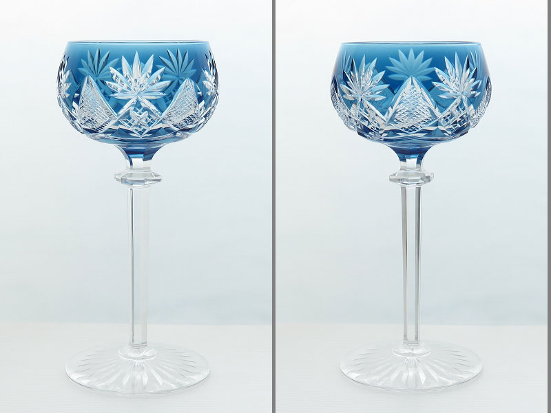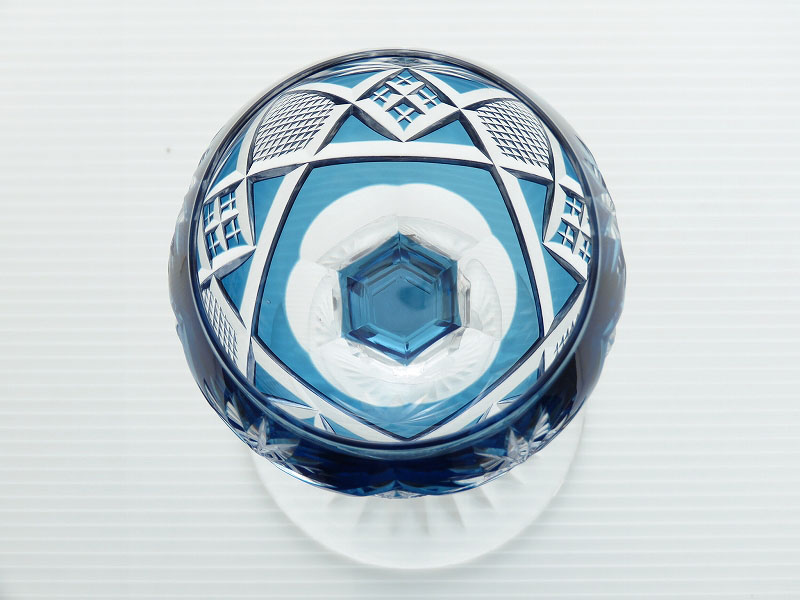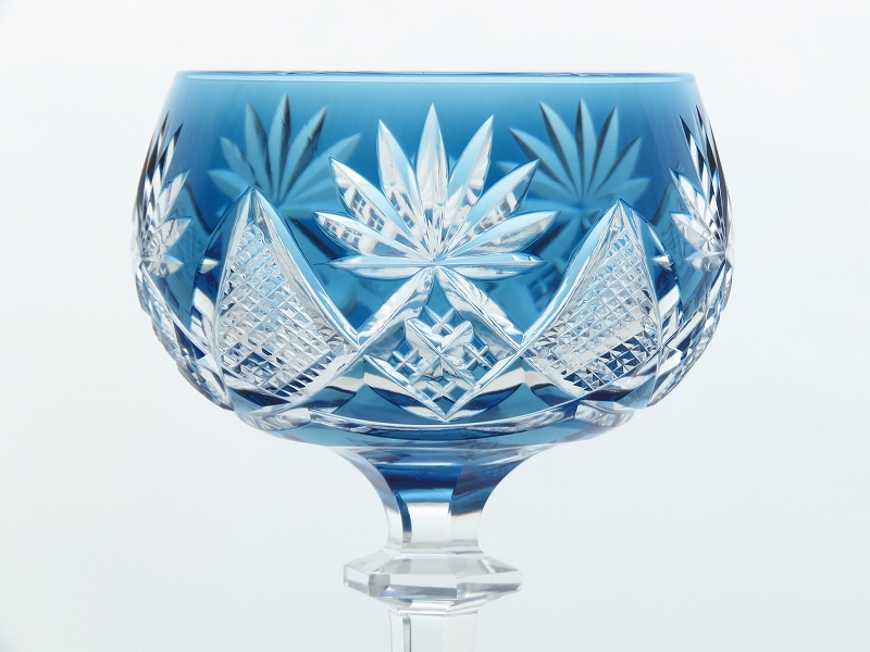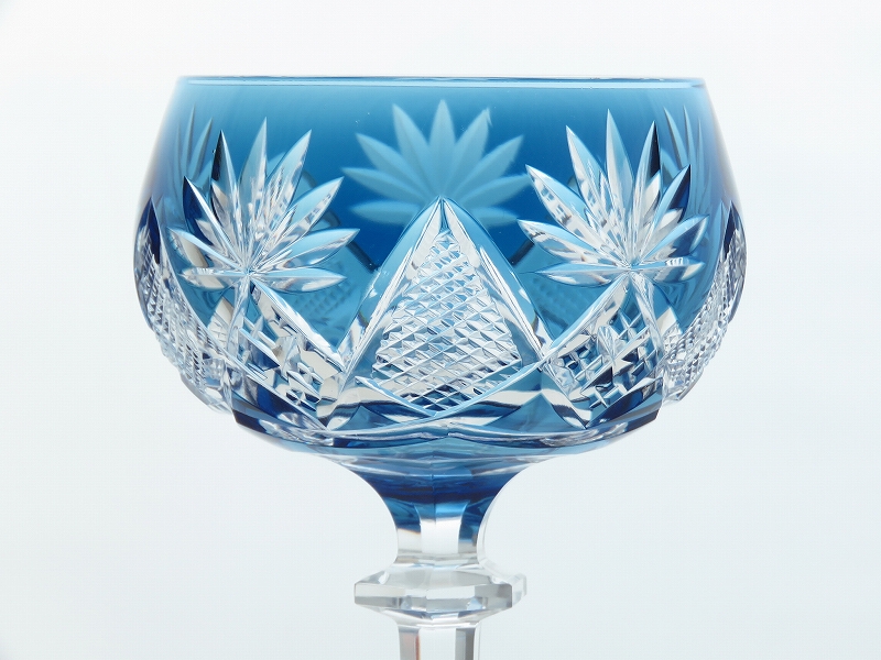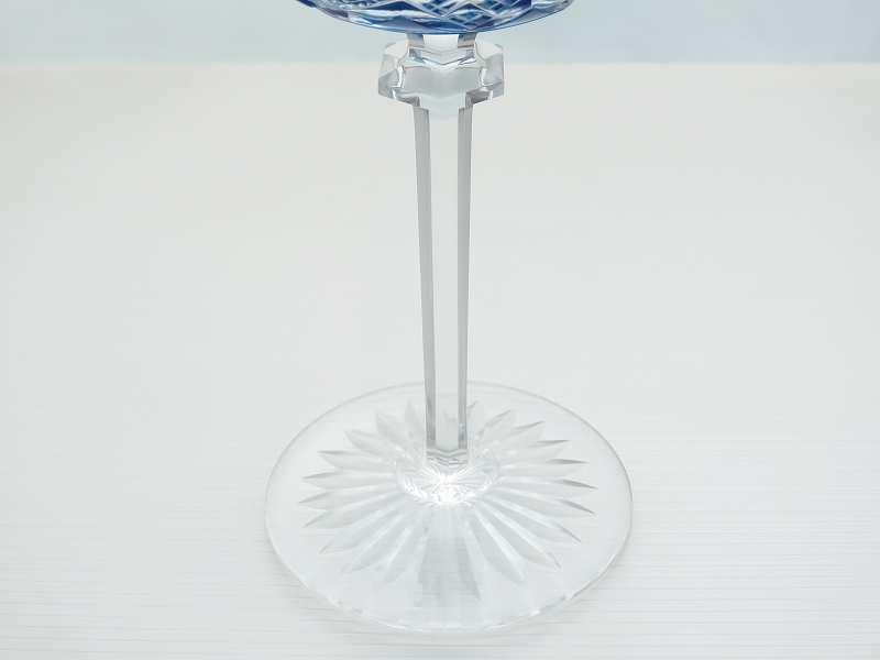 ベルギーで買い付けたブルーのクリスタルグラスです。現地のディーラーからヴァル・サン・ランべールのビンテージグラスと説明を受け購入しました。長いステムと膨らんだカップが特徴のワイングラスです。