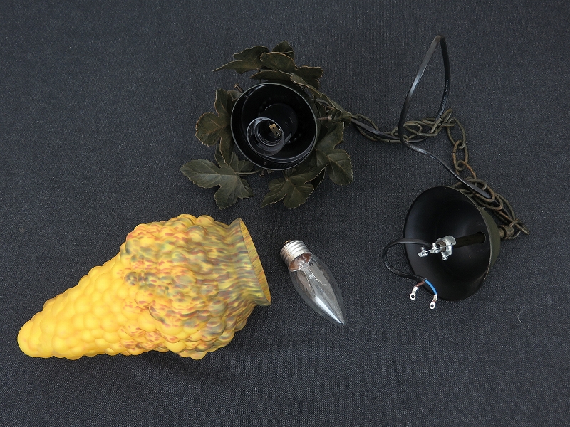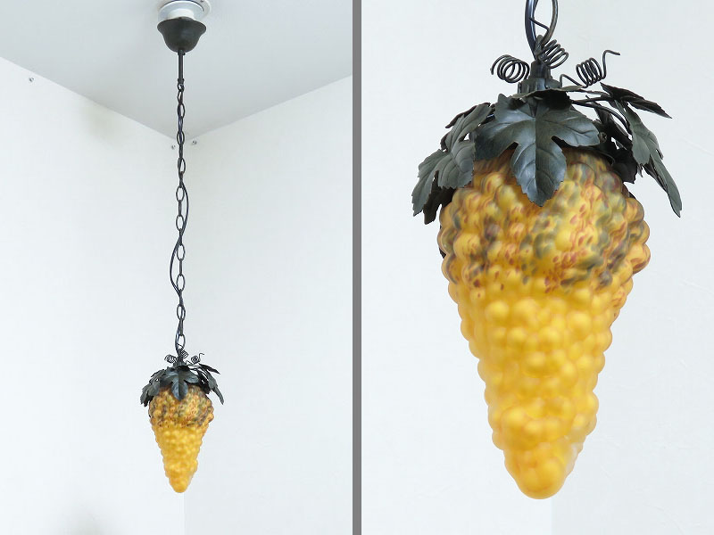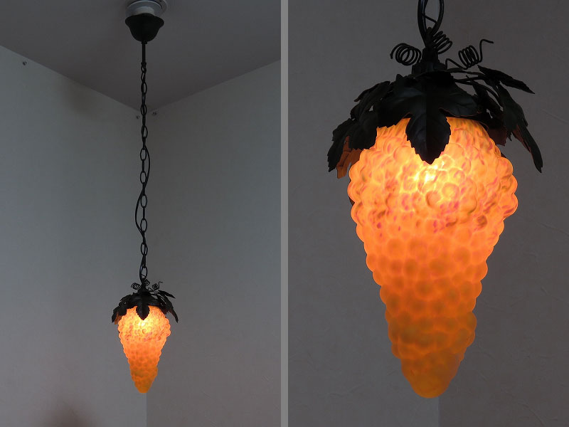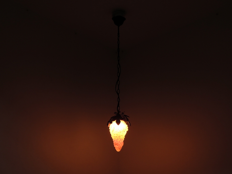 ベルギーの雑貨店で見つけたペンダントライトです。アンティークではありませんが葡萄のシェードの雰囲気が良かったので買い付けました。電球は 40W まで取り付けられますが、シェードの色が白く飛びますのであまりお勧めではありません。
