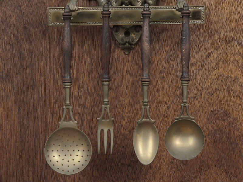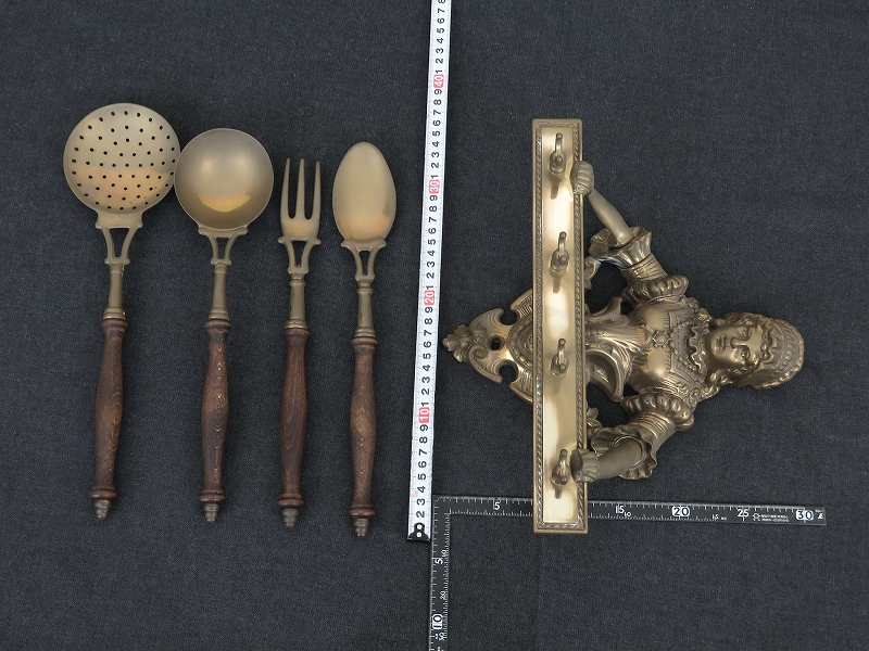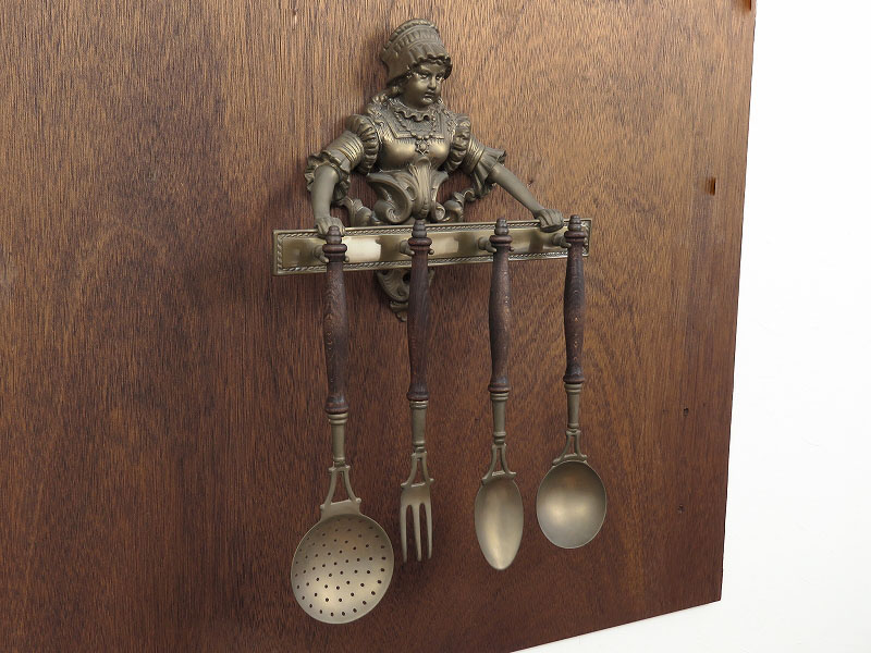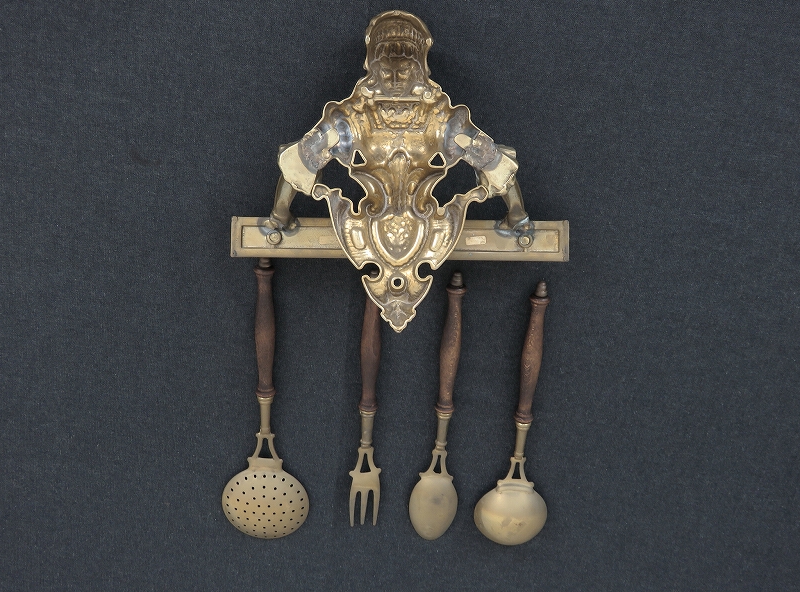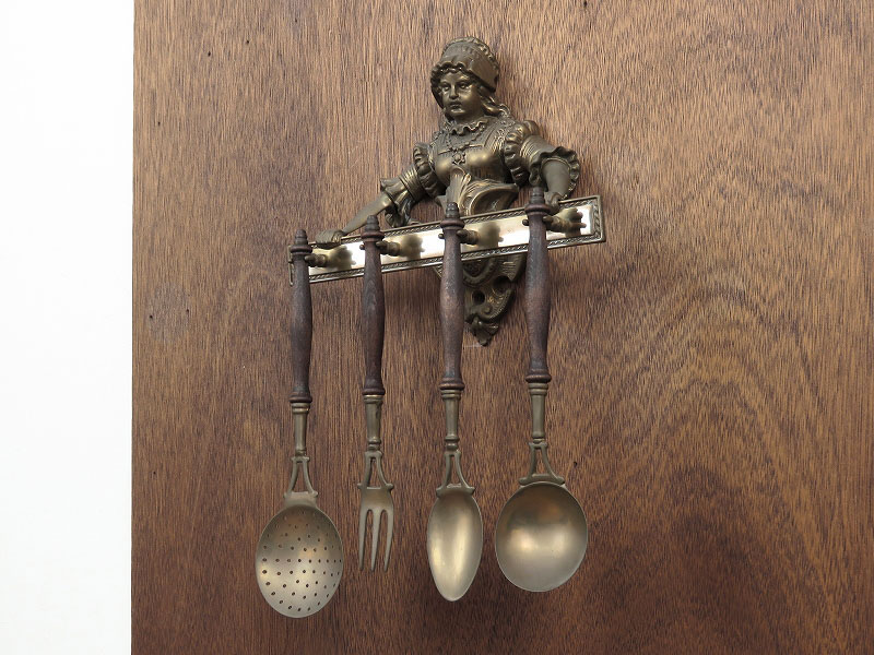 ベルギーの雑貨店で見つけた真鍮製の古い壁掛けカトラリーセットです。アンティークではありませんが、デザインと風合いが良かったので購入しました。また、2.6 kg と重さもあり重量感とノスタルジックな雰囲気があります。店頭でディスプレイしておりましたので、経年による変色がありよい風合いになっています。