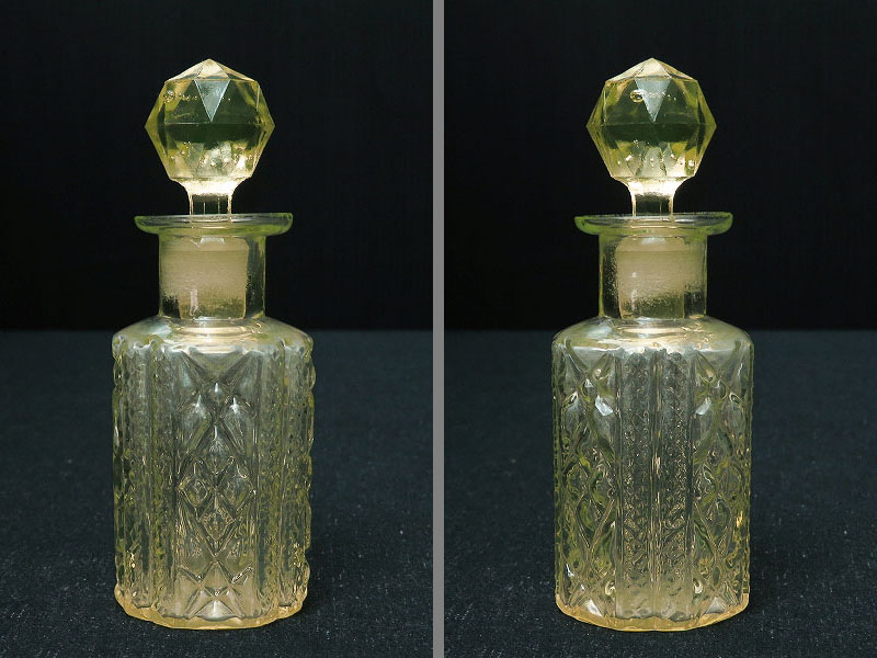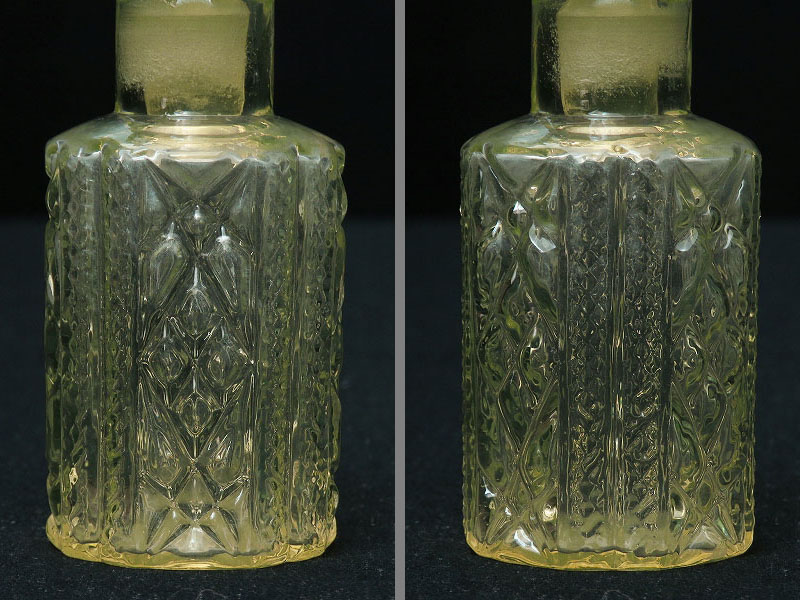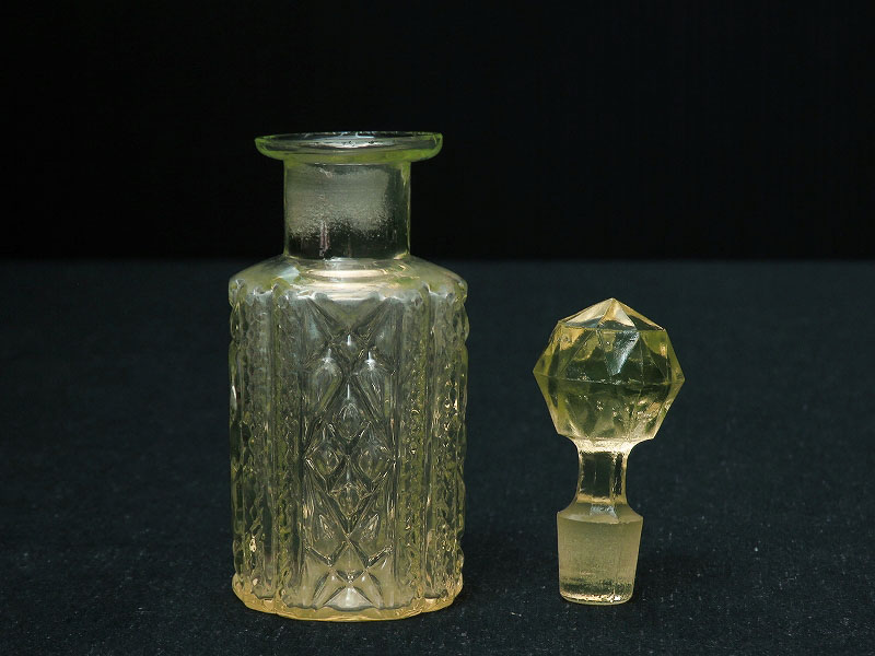 美しいカットが施されたウランガラスの小さな香水瓶(ヴァセリンガラス)