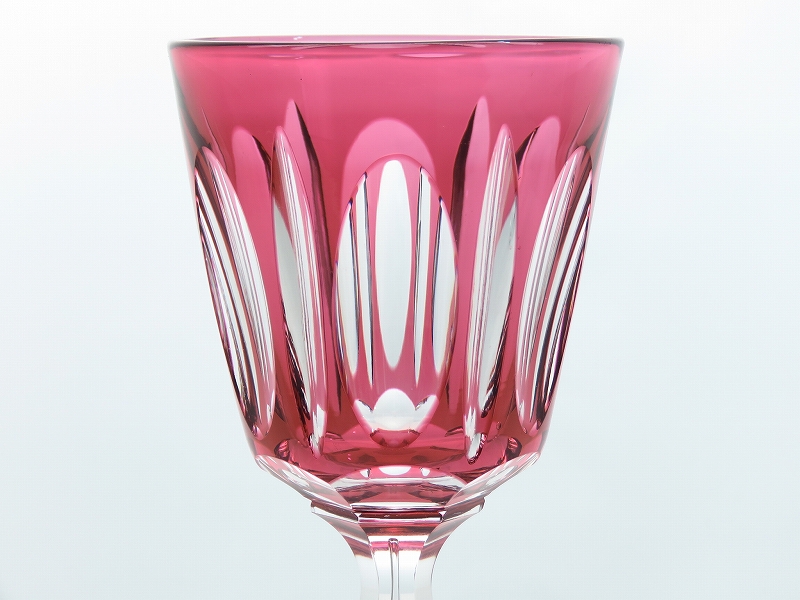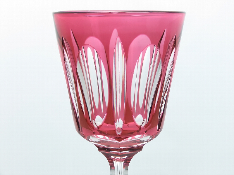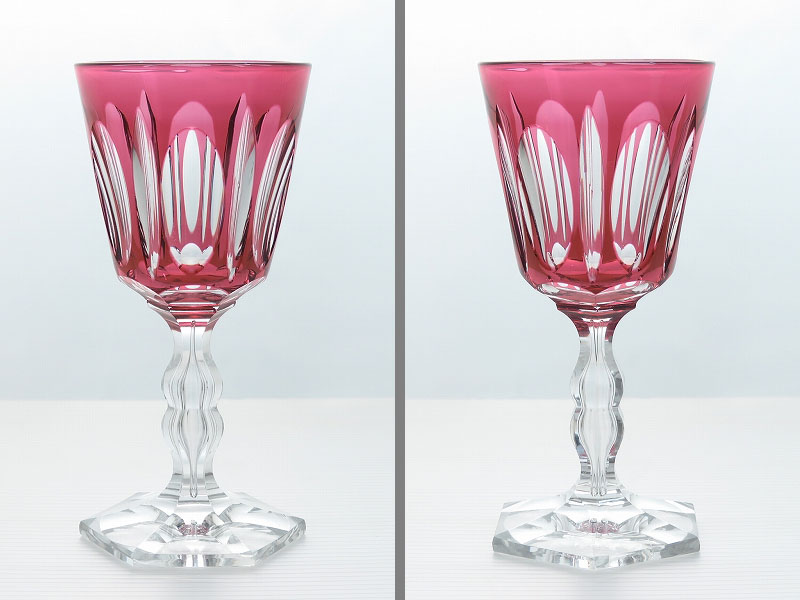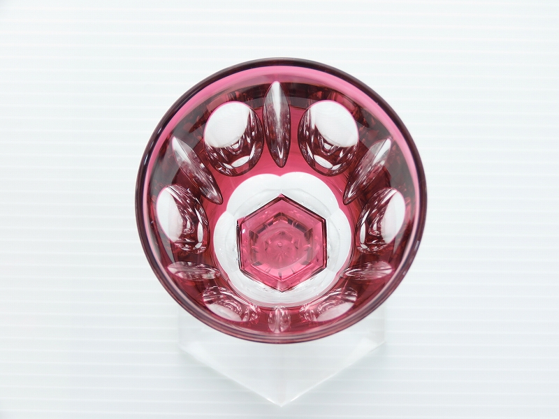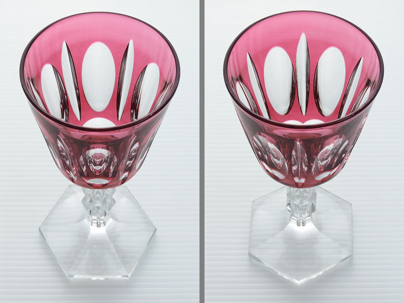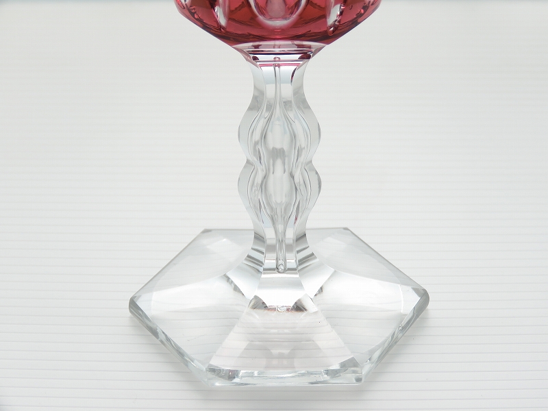 フランスで買い付けた赤いクリスタルの古いリキュールグラスです。六角形の台座と美しいカットのステムが魅力的な脚付きのグラスです。