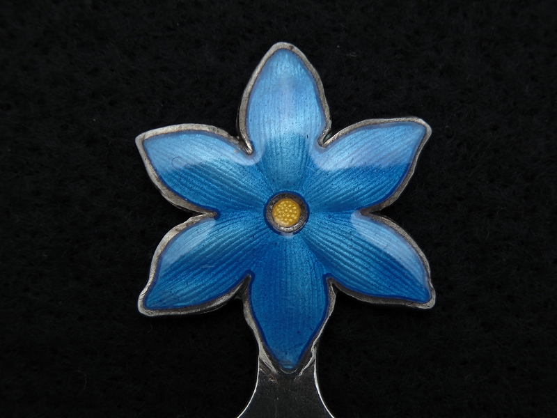 青いエナメルの花がデザインされたスターリングシルバーのブックマーク / しおり
